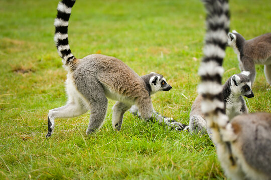 Ring-tailed lemur (Lemur catta) standing alert on green grass.
