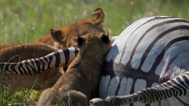 Lioness and Cubs Feeding on Zebra in the African Savannah
