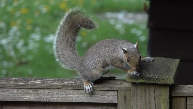 Grey Squirrel (Sciurus carolinensis) on a garden fence giving an alarm call (due to a cat in the garden). Kent, UK.