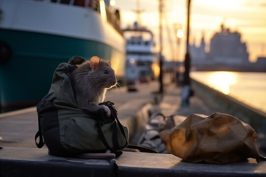 A rat tourist hides in a backpack against the backdrop of a ship. Adventure humor. Home traveler. Mouse traveler. Tourism, travel, hiking with animals. Copy space. I'm waiting for it to start