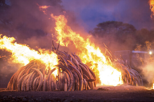 View of a towering pyre of ivory tusks ablaze, flames reaching skyward against a dusky sky, a stark reminder of conservation efforts, Nairobi, Nairobi County, Kenya.