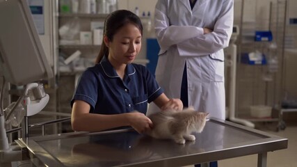 A young Asian doctor examining a cat in the clinic with other doctor Stock Video