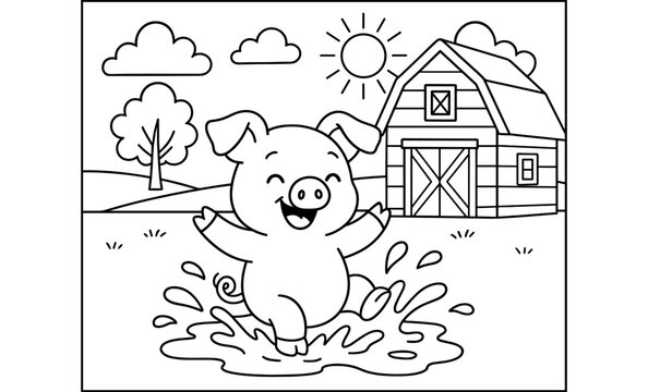 Happy pig splashes in mud puddle on a sunny farm day coloring page