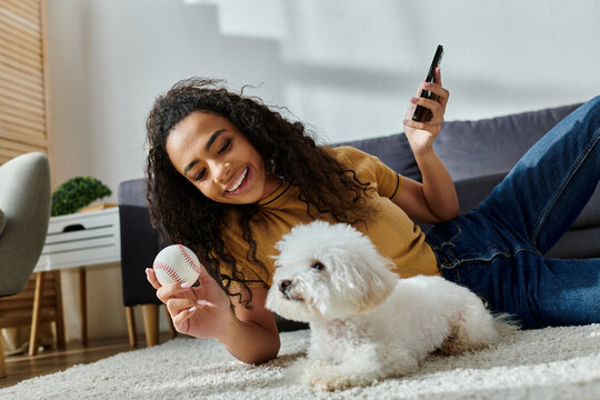 A woman lounging with her bichon frise and checking her phone.