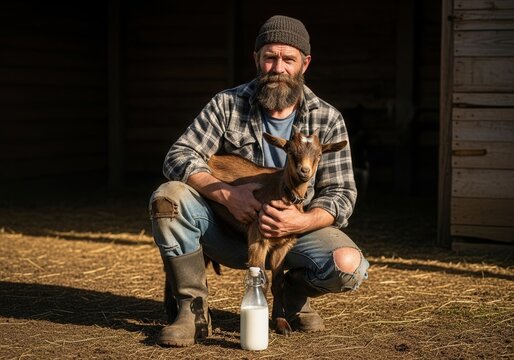 Bearded farmer squatting with baby goat and fresh milk bottle in barn