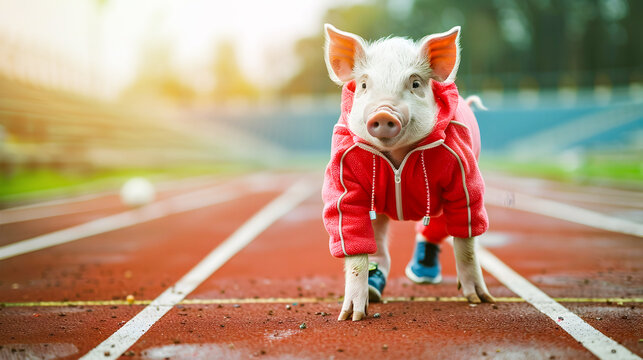 A playful and imaginative digital depicting a mischievous piglet wearing a vibrant sports tracksuit and one sneaker  standing confidently on a stadium running track  ready to sprint and compete