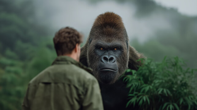 Gorilla facing man in green jungle mist wildlife encounter communication between human and animal conservation concept forest background