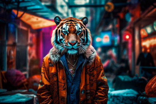 cat. happy. in hipster clothes with a laptop, concept of casual clothes and portrait of an animal behind a laptop. unusual light. bokeh plain background. place for text.