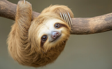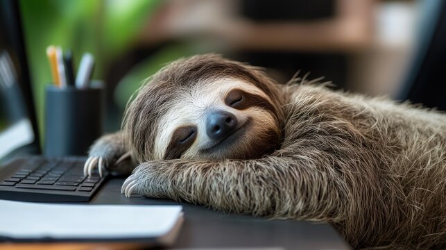 Sleepy sloth napping on office desk, blurred background