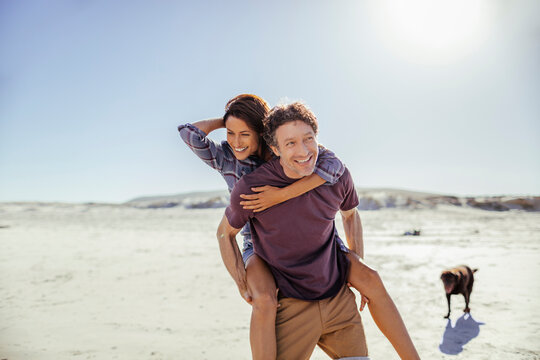 Couple enjoying a piggyback ride on the beach with their dog