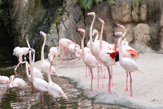 Group of vibrant flamingos interacting near water in a tropical zoo exhibit. Perfect for wildlife, animal behavior, exotic travel, and nature-related content.