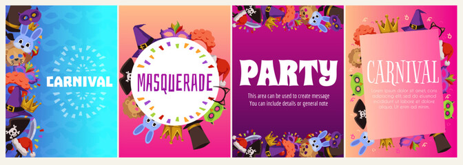Carnival and masquerade invitation posters set, flat vector illustration.