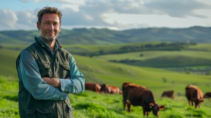 Playful and Intelligent Border Collie Herding a Flock of Sheep in a Bright Scenic Countryside Meadow with Green Grass and Rolling Hills in the Background