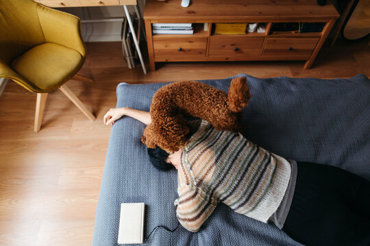 Woman petting golden retriever dog at home in living room lifestyle pet care happy owner dog lover