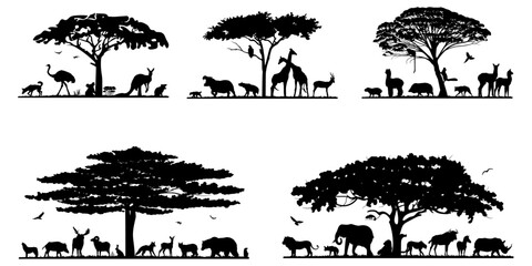 Forest landscape with animal silhouettes. Vector illustration.