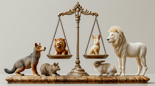 Wildlife Balance on the Scales of Justice.Artistic depiction of various animals on a scale of justice, symbolizing equity in animal rights