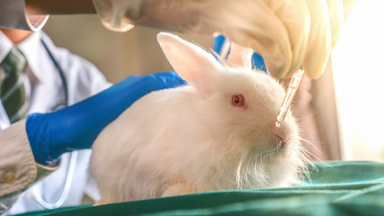 The closeup of a white rabbit in the laboratory with doctor in uniform with stethoscope and going to make injection with needle, in the concept of using animal for experiment