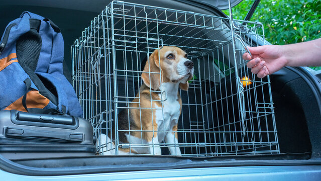 Rear of the bus. Open trunk of a car. Beagle dog sitting in the car. Handmade aluminium gates to protect dogs.