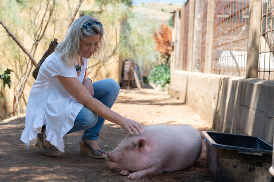 Young volunteer with a piglet, The Sanctuary at Soledad, Mojave