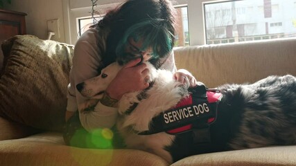 Neurodivergent woman showing affection and receiving support from her service dog, a border collie, in a comfortable home setting