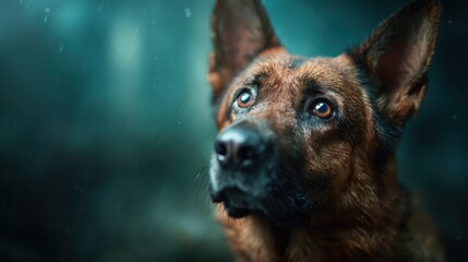 A close-up shot of a German Shepherd dog with expressive eyes, looking upwards with a reflective expression, capturing a moment of emotion, sensitivity, and loyalty.