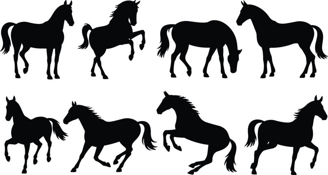 Horse silhouettes collection, running horses, standing horses, grazing horses, wild stallion artwork, black vector illustration, equestrian design, farm animal nature art