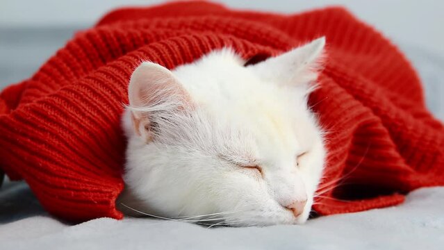 Beautiful cute white fluffy Angora cat lying sleeping on bed at home in red sweater in cold weather.domestic pet,mockup, advertising of goods for kittens.Winter Holidays,relax.
