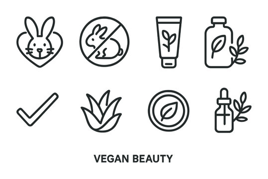 Vegan beauty outline icon set – linear style for cruelty-free cosmetics and skincare: bunny, no animal testing, lotion bottle, essential oil, aloe vera, check mark, leaf