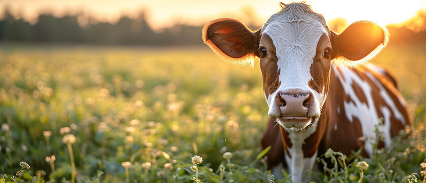 Cow in a meadow. Livestock animal, organic milk and green grass. Space for text.