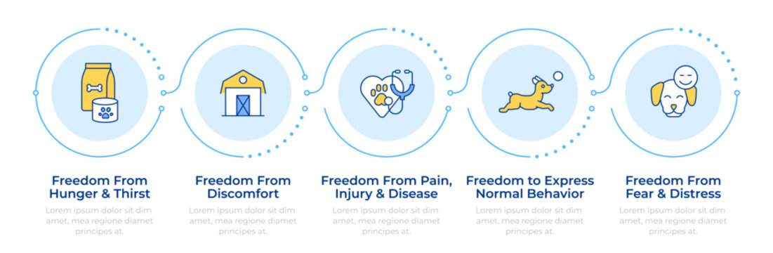 Animal welfare freedoms infographic 5 steps. Farming, healthcare. Vaccination, treatment. Flow chart infochart. Editable vector info graphics icons. Montserrat-SemiBold, Regular fonts used