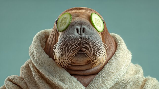 Walrus Relaxing With Cucumber Slices on Eyes Wrapped in a Cozy Towel Generative AI