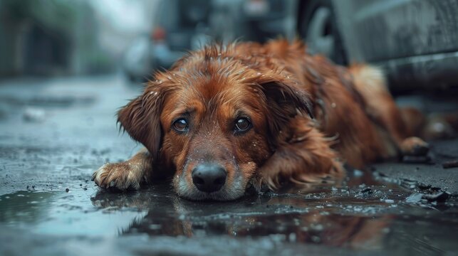 Close-up of a hungry, abandoned dog, soaked from the rain, lying on a desolate street, highlighting the importance of animal welfare and rescue efforts