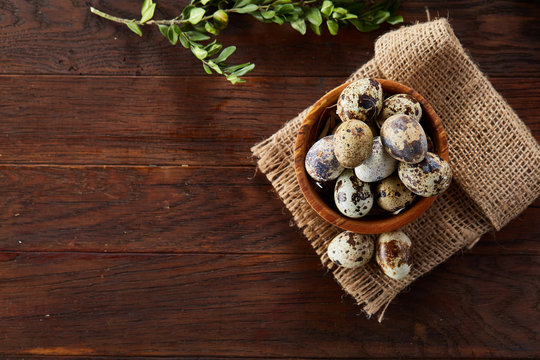 Bowl with eggs quail, eggs on a homespun napkin, boxwood on wooden background, close-up, selective focus