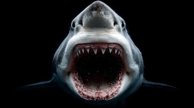 Close-up of great white shark with open jaws in deep ocean darkness.