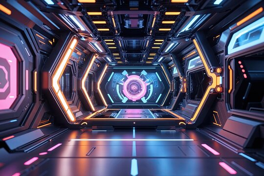 Digital branding guide with holographic elements, animated style, neon blue and pink, futuristic and sleek