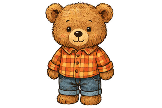Cute bear character in checkered shirt and jeans stands cheerfully in an animated style