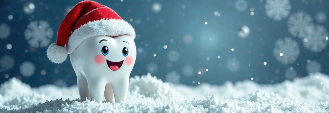 A happy tooth wearing a Santa hat standing on light blue background with snowy accents whimsical holiday themes, dental health, xmas greeting in dental clinic banner