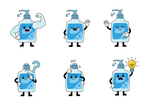 Cute animated hand sanitizer bottle characters in different poses