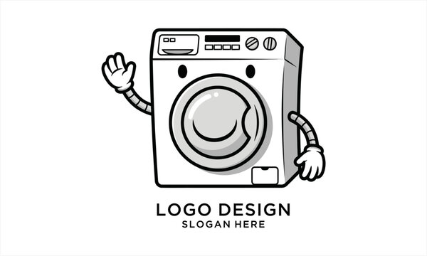 Washing Machine Cartoon Character Waving Hand Black and White Illustration.