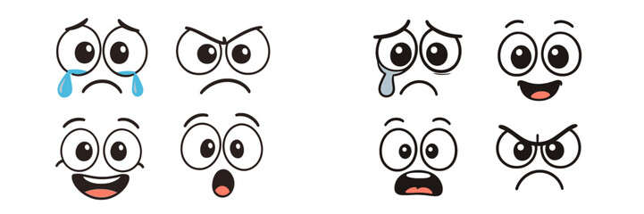 Various emotive expressions displayed by cartoon faces showcasing joy, sadness, surprise, and anger in simple designs