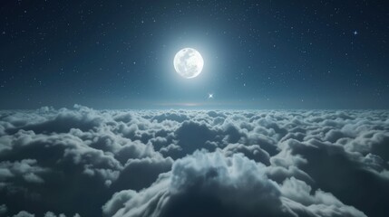 3d rendering of full moon shining above the clouds at night sky background.