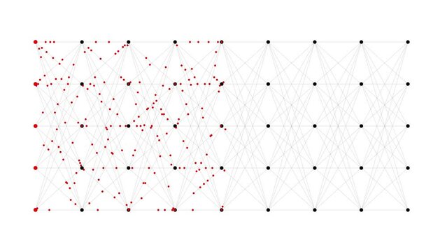 Data center server room with glowing animated flow visualization of information transmission