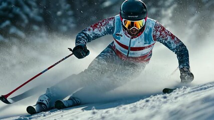 Alpine skier racing down a challenging slalom course, with gates, snow spray, and a focused expression. . Video