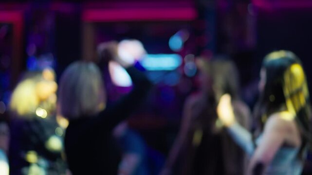 Stylish group enjoying lively night, Bright pink lounge with animated conversations and neon effects