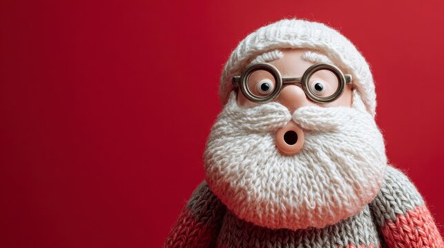 Close-up of a surprised, animated figure resembling a festive character with a white beard, glasses, and knit hat, against a bright red backdrop