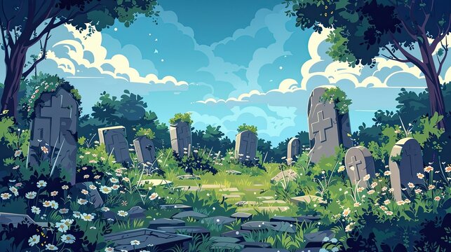 Serene animated cemetery scene surrounded by lush greenery and clear skies, depicting a peaceful and calm atmosphere.