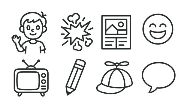 Line style icons of cartoons: animated character, comic explosion, storyboard panel, laughing emoji, cartoon TV, drawing pencil, colorful hat, comic bubble.