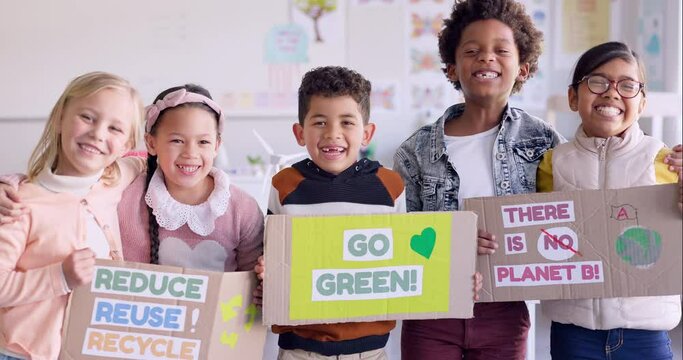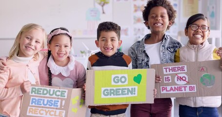 Poster, recycle and happy children in a classroom to support sustainability on earth day. Portrait, smile and campaign with kids in class for climate change awareness or going green initiative