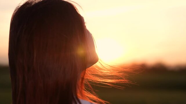 face person outdoors, woman face look up serenity silhouette, relax nature pleasure, beautiful girl with red hair wind looking sunset, evening thoughts, dreaming twilight, people happiness dream face