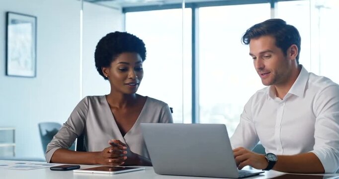 Engaged diverse colleagues collaborating on laptop in modern bright office, discussing project.